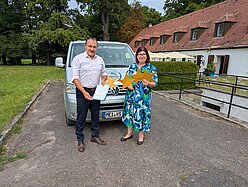 Auf dem Foto: John Piotrowsky, Hoteldirektor und Prokurist der Churfürstlichen Waldschänke Moritzburg mit Katrin Kerpa, DEHOGA Sachsen vor der idyllischen Waldterrasse .