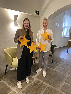 Bild (v.l.n.r.): Kathleen Rabe (DEHOGA Sachsen) und Silke Seckel (Boutiquehotel Grüner Zweig) im Empfangsbereich des Hotels