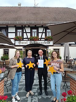 >Am 28.08.2025 haben wir gemeinsam mit dem Tourismusregion Zwickau e.V. dem Romantik Hotel Schwanefeld 4 Sterne Superior der deutschen Hotelklassifizierung verliehen. Aller 3 Jahre muss sich das Haus den Auditoren vorstellen und verschiedene Mindestkriterien erfüllen. Das Hotel überzeugt mit erstklassigem Service, einem großzügigen Wellnessbereich mit Außenpool und modern gestalteten Zimmern im Landhausstil. Für Feierlichkeiten wie bspw. Hochzeiten, Familienfeiern oder Firmentagungen stehen verschiedene Veranstaltungsräume bereit. Im Restaurant können sich die Gäste von regionaler Küche verwöhnen lassen.